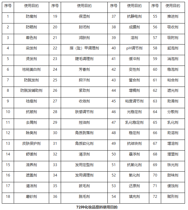 答:《化妝品原料使用目的技術指南(試行)》附表為《化妝品原料使用目的目錄》(以下簡稱《目錄》),包括72種原料使用目的及說明。《目錄》是在充分參考國外相關標準的基礎上,依據我國現行法規(guī)標準以及行業(yè)使用情況等進行制定。使用目的具體如下: