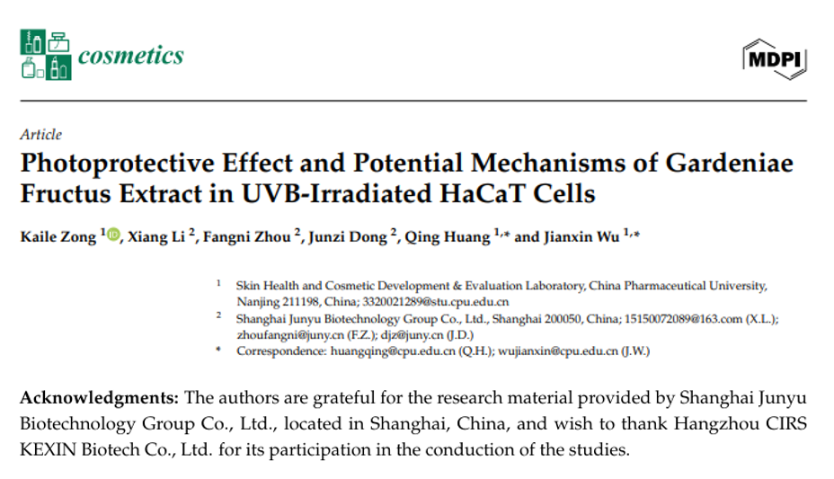 A breakthrough study on the anti-photodamage effects of Gardenia Fructus Extracts, jointly conducted by Hangzhou CIRS KEXIN Biotech Co., Ltd. (CIRS Biotech) and Shanghai Junyu Biotechnology Co., Ltd. (Junyu Group), has been published in Cosmetics, an internationally renowned SCI-indexed journal. The breakthrough study provides scientific validation for the development of photoprotective ingredients and the establishment of its efficacy evaluation systems.