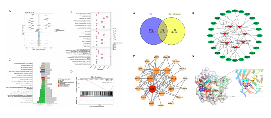 Combining proteomics and network pharmacology, DIA quantitative proteomics identified key anti-photodamage targets (e.g., G2/M checkpoint) in Gardenia extract. Network pharmacology analysis pinpointed core regulators (TP53, IL1B, MMP9). Geniposin-p53 molecular docking validation established a cross-omics verification paradigm for mechanistic studies of Gardenia extract's photoprotective effects.