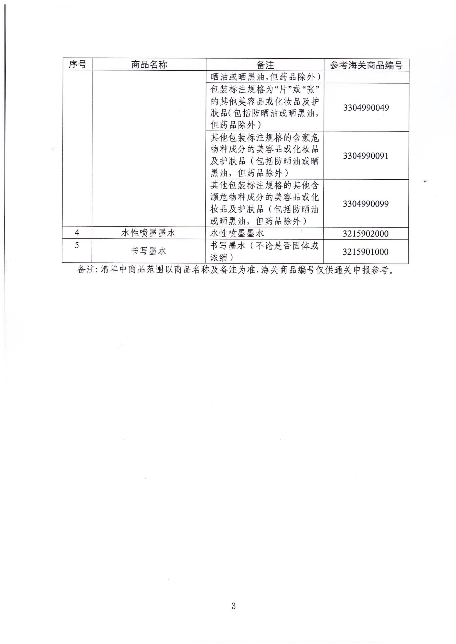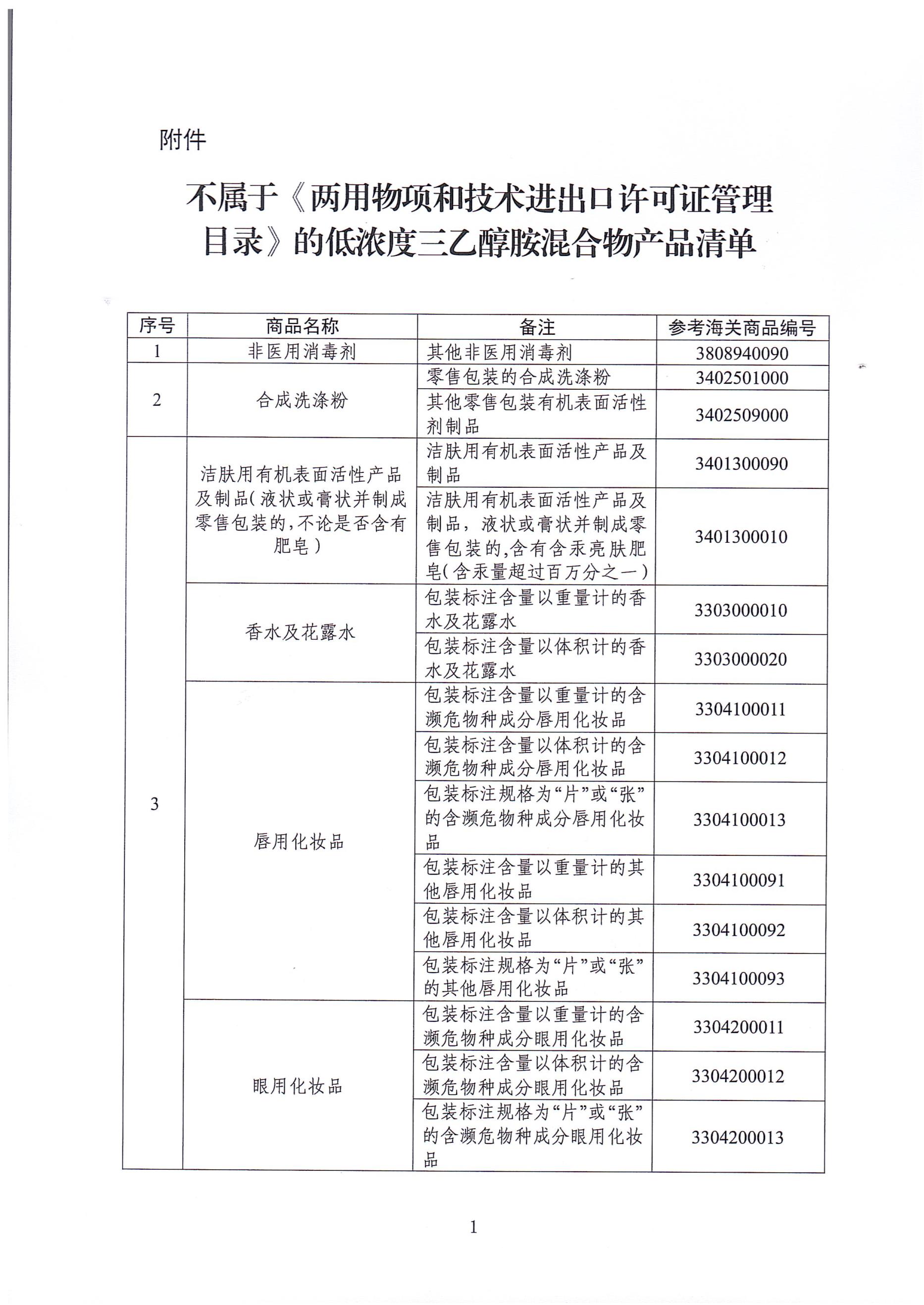 三乙醇胺含量較低的非醫(yī)用消毒劑、合成洗滌粉、化妝品、墨水等消費類商品(詳見附件),防擴散風險可控,不屬于《兩用物項和技術進出口許可證管理目錄》中三乙醇胺(海關商品編號2922150000)和三乙醇胺混合物(海關商品編號3824999950)項下的管控物項,無需辦理監(jiān)控化學品進出口審批手續(xù),無需辦理兩用物項和技術進出口許可。