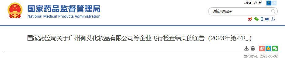 2023年6月1日,國(guó)家藥監(jiān)局發(fā)布關(guān)于廣州御艾化妝品有限公司等企業(yè)飛行檢查結(jié)果的通告(2023年第24號(hào)),具體內(nèi)容如下: