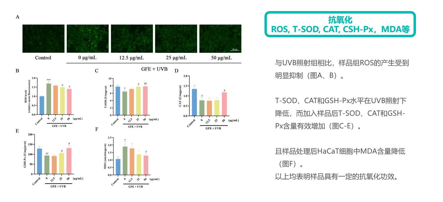 UVA刺激人成纖維細胞 | 抗氧化(模擬UVA損傷) | ROS | 熒光染色 | |