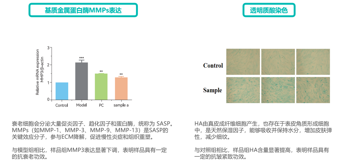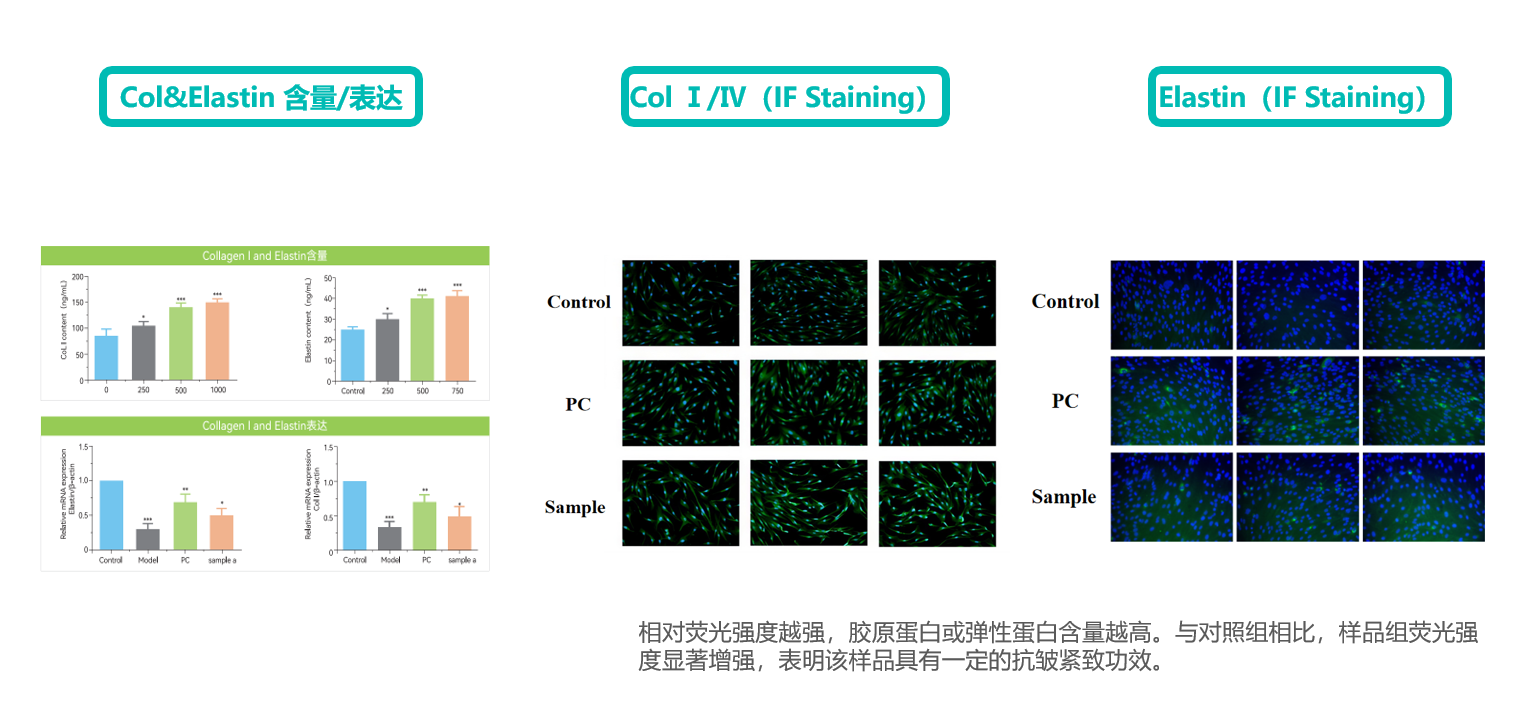 細胞分泌膠原蛋白增強皮膚彈性 | 膠原蛋白(ⅠⅢ Ⅳ等) | RT-qPCR | ||