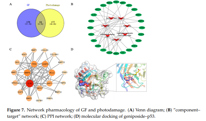 蛋白質(zhì)組學(xué)與網(wǎng)絡(luò)藥理學(xué)結(jié)合:通過DIA定量蛋白組技術(shù)發(fā)現(xiàn)G2/M檢查點等梔子抗光損傷關(guān)鍵靶標(biāo);運用網(wǎng)絡(luò)藥理學(xué)分析鎖定TP53/IL1B/MMP9等核心靶點;創(chuàng)建梔子苷-p53分子對接驗證,為梔子提取物抗光損傷機(jī)制研究提供多組學(xué)交叉驗證范式。