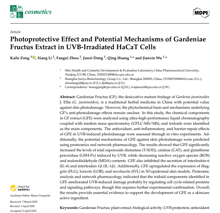 近日,杭州瑞旭科新生物技術(shù)有限公司(以下簡稱“科新生物”,CIRS Biotech)與上海君裕生物科技集團(tuán)有限公司(以下簡稱“君裕集團(tuán)”)聯(lián)合開展的梔子提取物(Gardeniae Fructus Extract)抗皮膚光損傷研究取得突破性進(jìn)展。該項研究成果已發(fā)表于國際知名期刊《Cosmetics》(SCI收錄),為抗光損傷類化妝品功效原料的研發(fā)與評價體系構(gòu)建提供了重要科學(xué)依據(jù)。