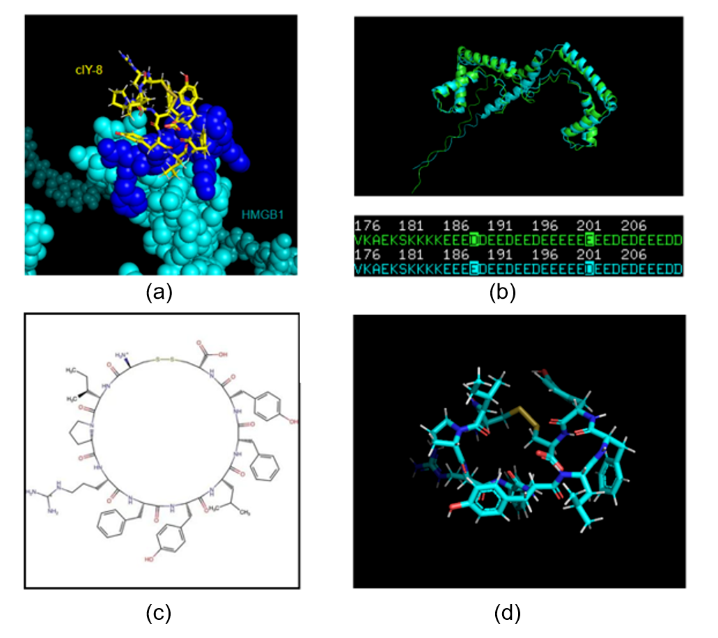 圖3 (a) 多肽cIY8(黃色顯示)與HMGB1蛋白(青色顯示)的預(yù)測結(jié)合模式,潛在相互作用區(qū)域以海藍(lán)色標(biāo)示。(b) 人類(青色顯示)與小鼠(綠色顯示)HMGB1序列及結(jié)構(gòu)同源性分析。(c) 多肽cIY8的二維結(jié)構(gòu)圖。(d) 通過分子動力學(xué)模擬獲得的多肽cIY8三維結(jié)構(gòu)(來源:文獻(xiàn)4)