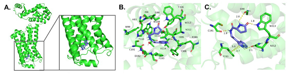 圖2 pGAEI與β2-AR的相互作用。(A) pGAEI配體結(jié)合于β2-AR蛋白正構(gòu)口袋的示意圖。針對配體周圍4Å范圍內(nèi)的殘基進(jìn)行分析,顯示了(B)氫鍵及(C)π-π相互作用。圖示中pGAEI以藍(lán)色標(biāo)示,β2-AR以綠色標(biāo)示(來源:文獻(xiàn)1)