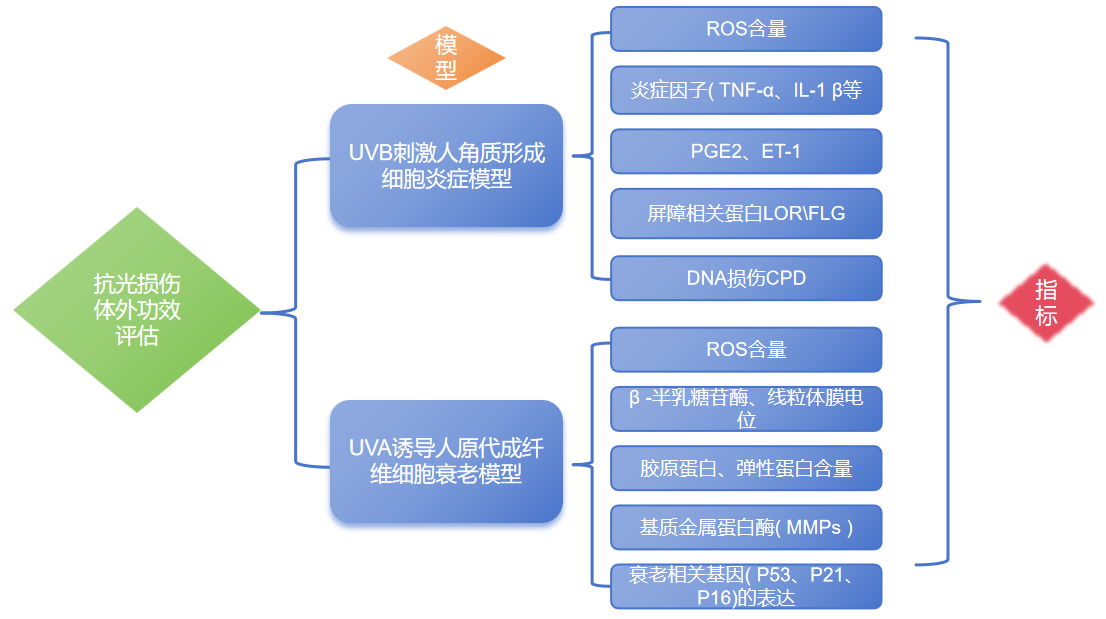 在深入探究光損傷的引發(fā)機(jī)制及影響后,我們構(gòu)建出一個(gè)依據(jù)角質(zhì)形成細(xì)胞的抗光損傷體外功效評(píng)估體系,用以評(píng)估化妝品原料及成品的抗光損傷效能。