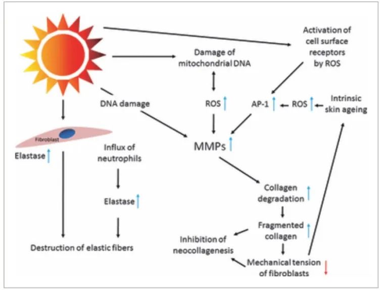 紫外線誘導的活性氧(ROS)和DNA損傷導致角質(zhì)形成細胞和成纖維細胞中基質(zhì)金屬蛋白酶的誘導增加。蛋白水解酶有助于ECM的降解。此外,紫外線照射直接刺激成纖維細胞中彈性蛋白酶的產(chǎn)生。導致部分降解的膠原蛋白和成纖維細胞的機械張力降低抑制了新膠原的發(fā)生。機械張力的降低導致ROS的進一步產(chǎn)生,這再次導致基質(zhì)金屬蛋白酶的表達增加[4]。