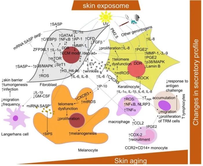 炎癥表現(xiàn)為血清炎癥細胞因子(如IL-6,IL-8和TNF-α)水平升高,不僅僅限于與年齡相關的全身性改變,還可能涉及皮膚老化。值得注意的是,衰老過程中積聚在皮膚中的衰老細胞在驅(qū)動皮膚發(fā)炎方面起主要作用[5]。它們表現(xiàn)出改變的分泌組,稱為衰老相關分泌表型(SASP),其包括促炎細胞因子,趨化因子,蛋白酶和生長因子,可顯著改變皮膚的微環(huán)境[6]。