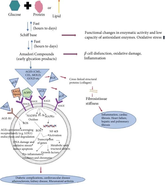 糖化反應,其實是非酶糖基化(Non-enzymatic glycation, NEG)反應俗稱糖化反應,是指還原性糖(如葡萄糖)上的羰基與蛋白質(zhì)、脂質(zhì)或核酸等大分子上的游離氨基之間所發(fā)生的非酶性縮合反應。糖(葡萄糖和果糖)和真皮中的膠原蛋白發(fā)生反應后,會先形成初級糖基化產(chǎn)物(可逆),后面會繼續(xù)形成高級糖基化終末產(chǎn)物(AGEs,這是不可逆的物質(zhì))。膠原蛋白在糖化反應下,結構被破壞,彈性會降低,同時又會強烈吸收紫外線,在紫外線的作用下產(chǎn)生更多自由基,從而導致皮膚衰老更嚴重,成為一個惡性循環(huán)[7-8]。