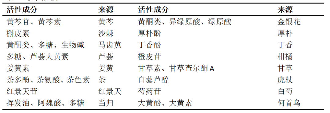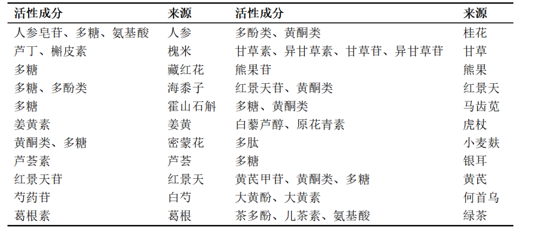 與傳統(tǒng)化妝品相比較,中藥來源的抗衰老成分是從植物中提取出來的天然物質(zhì),分子更細小,更容易被皮膚吸收和消化,而且不致在體內(nèi)產(chǎn)生沉積,目前市場上已有多種來源于中藥活性成分被用于化妝品的生產(chǎn)(見下表)[9-10]。