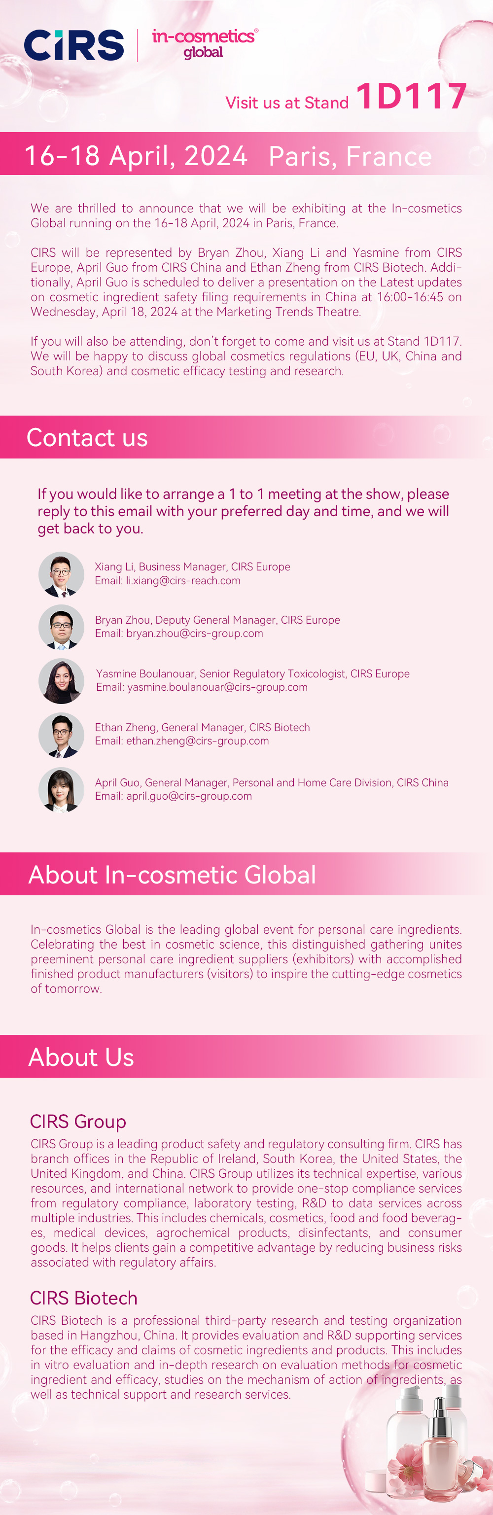 瑞旭集團期待與您在巴黎的相遇,誠邀您訪問我們的展臺(展位號:1D117),在此我們期待與您深入交流全球化妝品法規,包括歐盟、英國、中國及韓國、化妝品的檢測與研發,并分享我們的專業意見及在化妝品法規方面的經驗。共同開啟一個全新的行業視角,攜手邁向國際市場的更深層次合作。請預留您的日程,與我們共襄此次盛事。