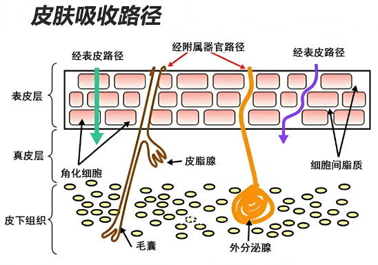 化妝品透皮吸收途徑主要有角質(zhì)層、毛囊、皮脂腺和汗管口。