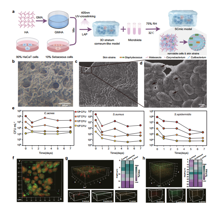 采用特殊高分子材料(光固化交聯(lián)水凝膠)模擬皮膚生態(tài)環(huán)境,成功復(fù)刻皮膚微生物菌群,首次實(shí)現(xiàn)皮膚菌群的體外長期穩(wěn)定定植。