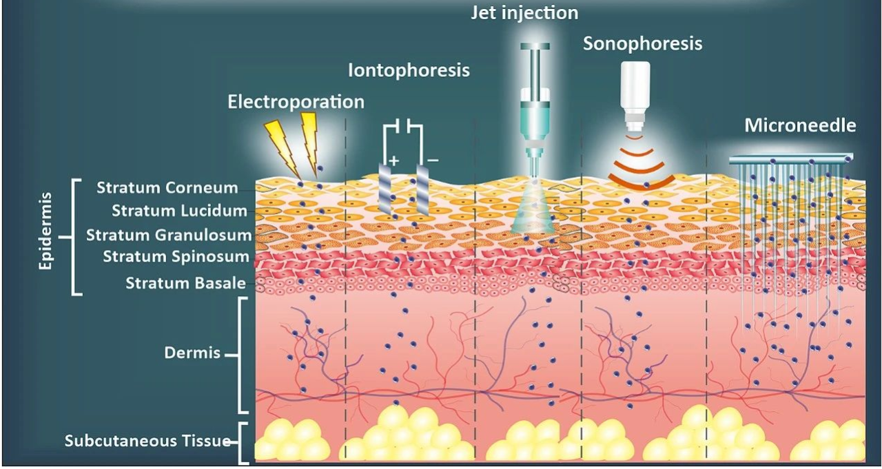 物理方法包括離子電滲療法、電穿孔、聲電滲透、微針、無針噴射注射器等,如下圖所示。這些技術(shù)主要遵循兩個原則,即通過粒子加速器將粒子或藥物輸送到皮膚中(如無針噴射注射器),以及使用梯度場誘導的對流遞送藥物粒子(如離子電滲療法、聲電滲透、磁電滲透)。